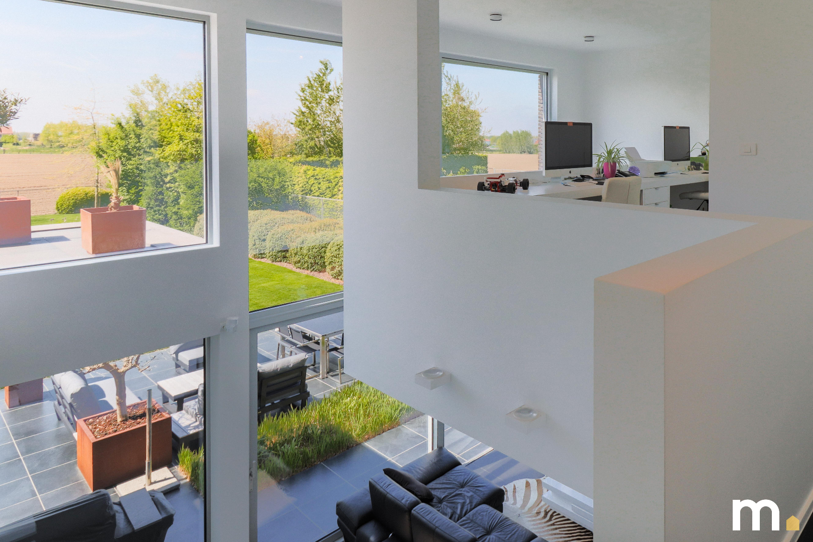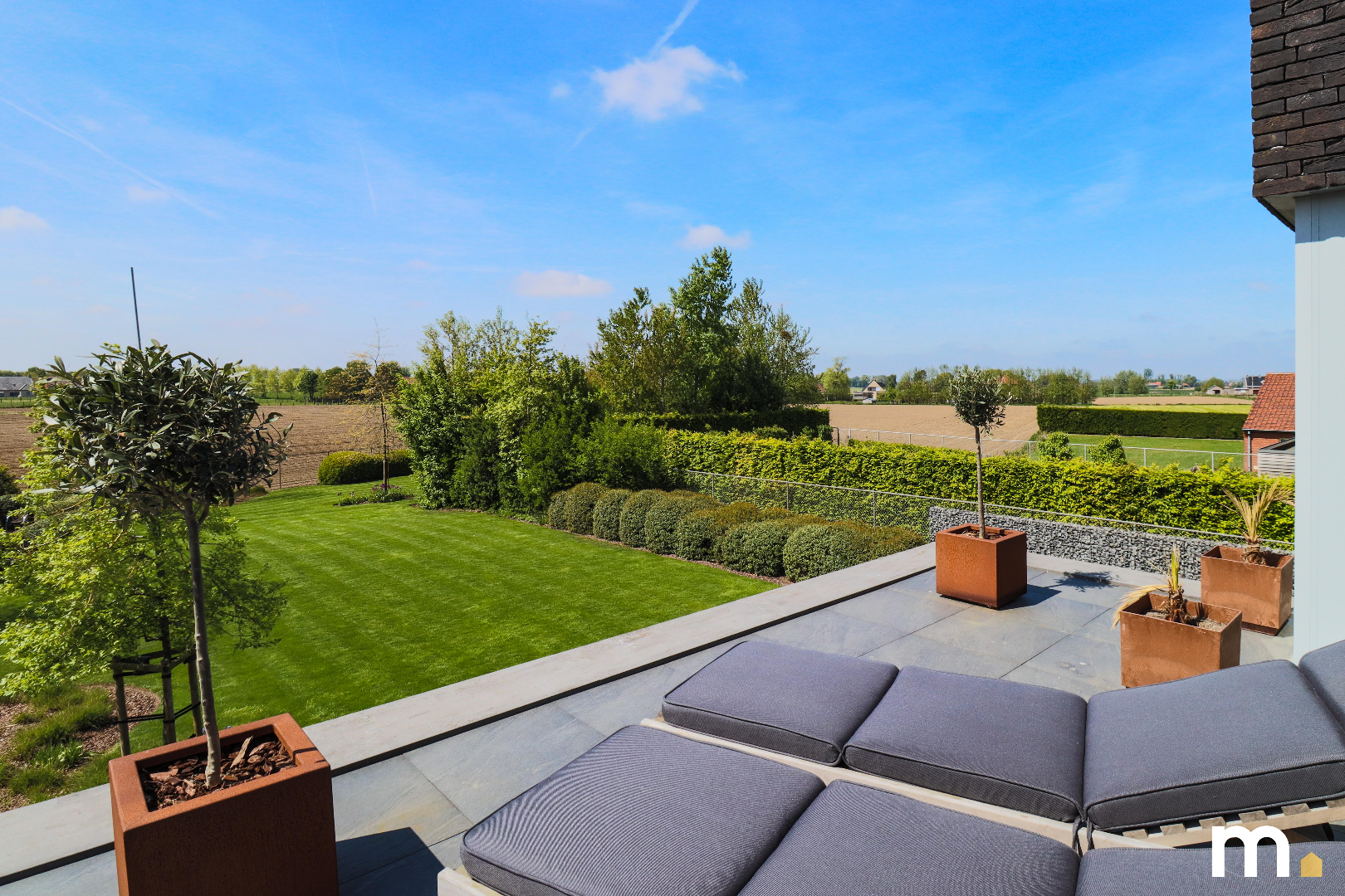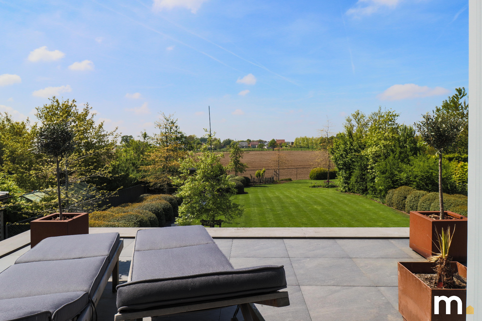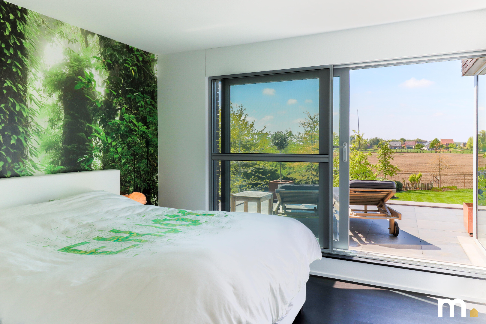 Op de verdieping hebben we een prachtige master bedroom met terras uitkijkend op de tuin en achterliggende landerijen, aansluitend een mooie comfortabele dressing en ruime badkamer met inloopdouche - bad in corian en dito twee lavabo's.