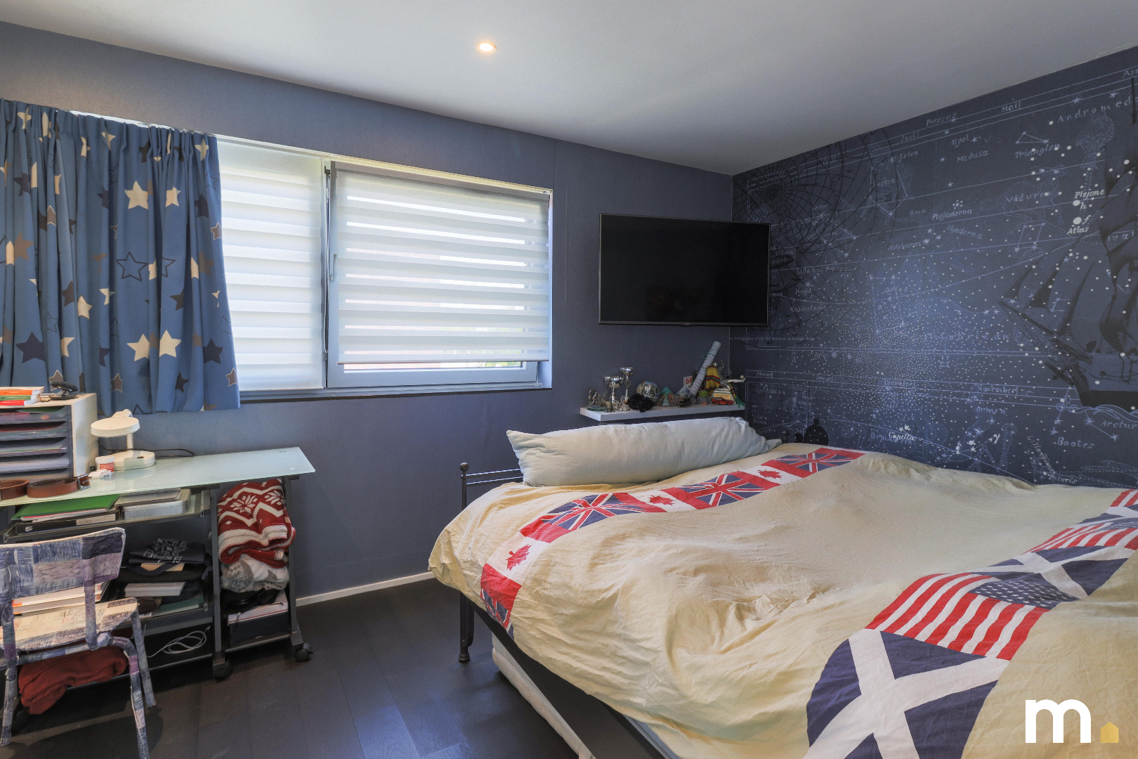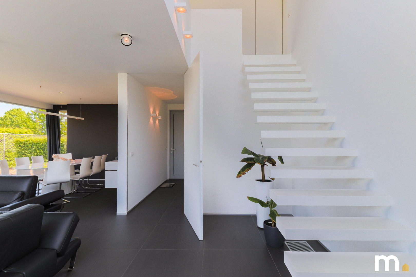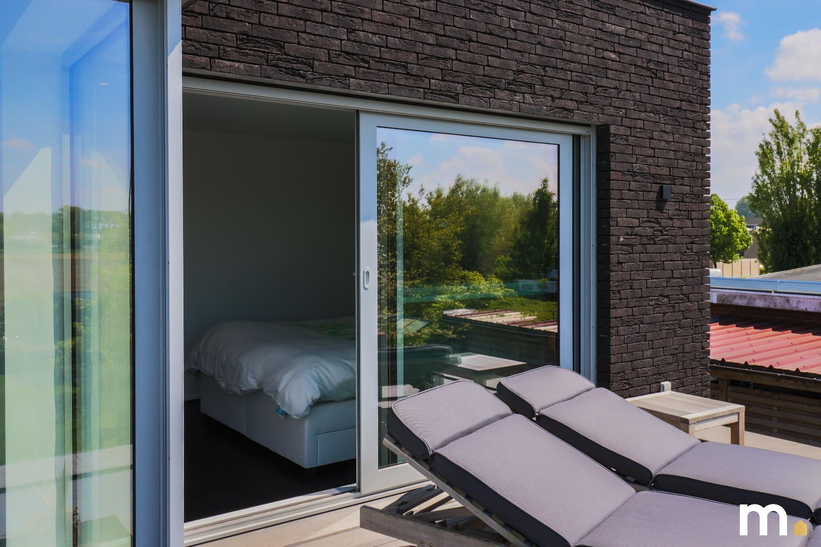 Op de verdieping hebben we een prachtige master bedroom met terras uitkijkend op de tuin en achterliggende landerijen, aansluitend een mooie comfortabele dressing en ruime badkamer met inloopdouche - bad in corian en dito twee lavabo's.