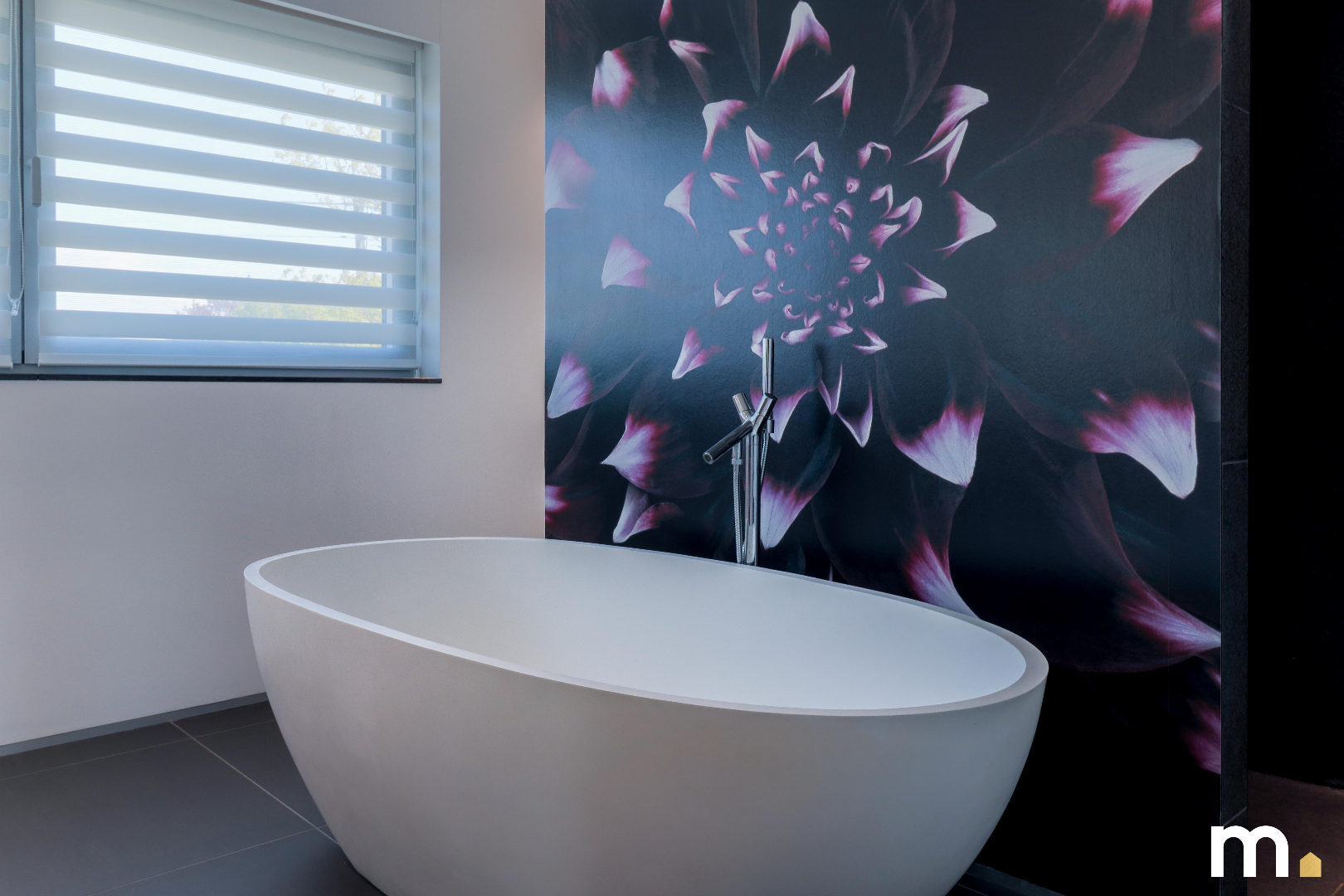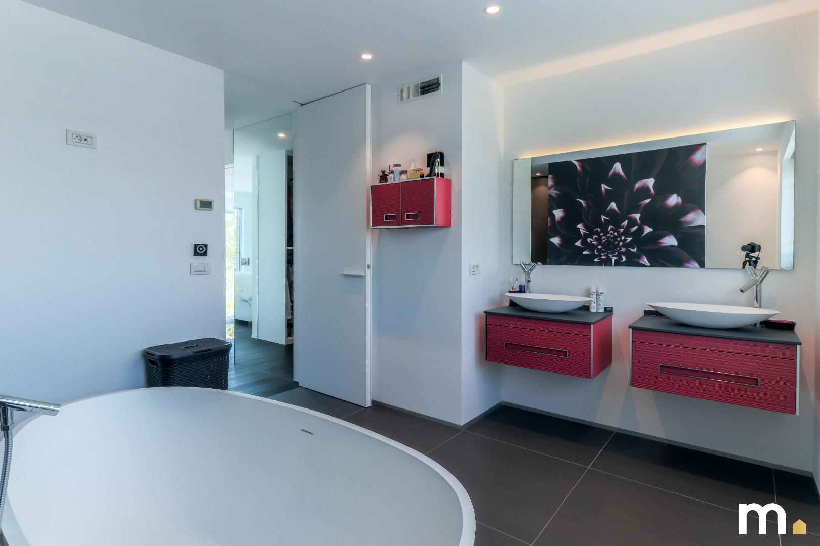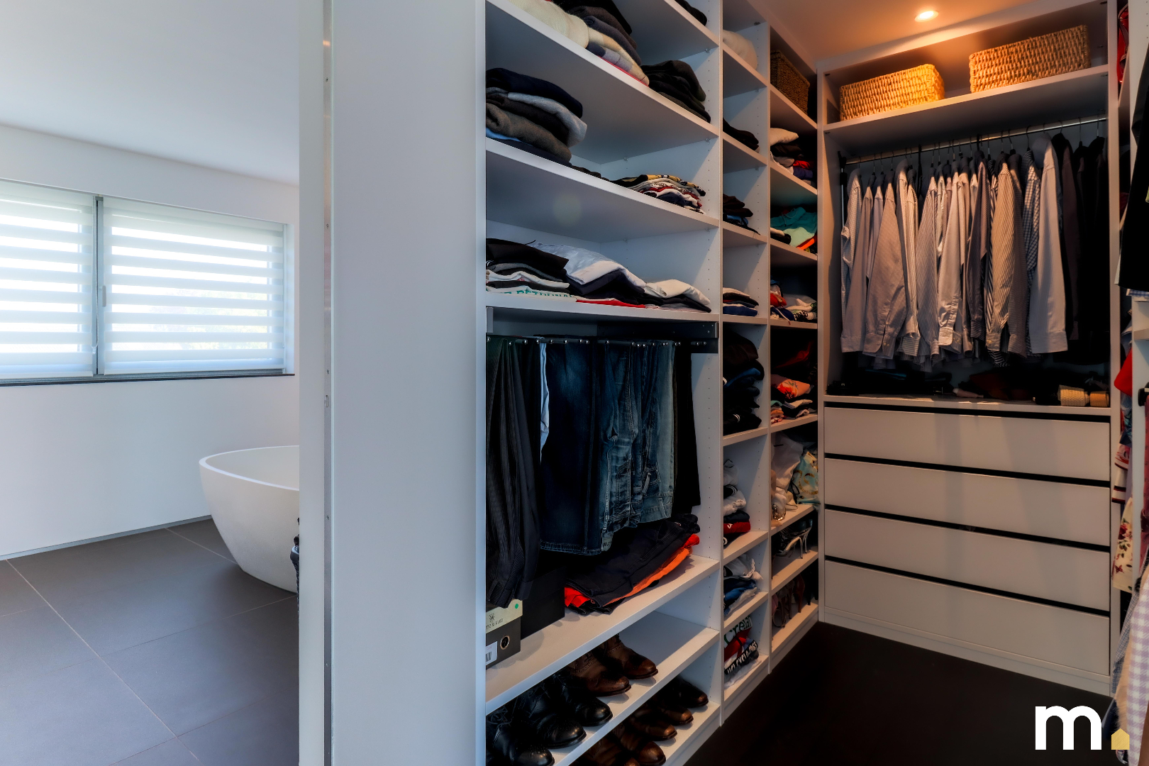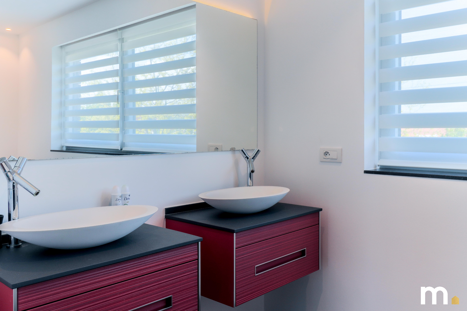 Op de verdieping hebben we een prachtige master bedroom met terras uitkijkend op de tuin en achterliggende landerijen, aansluitend een mooie comfortabele dressing en ruime badkamer met inloopdouche - bad in corian en dito twee lavabo's.