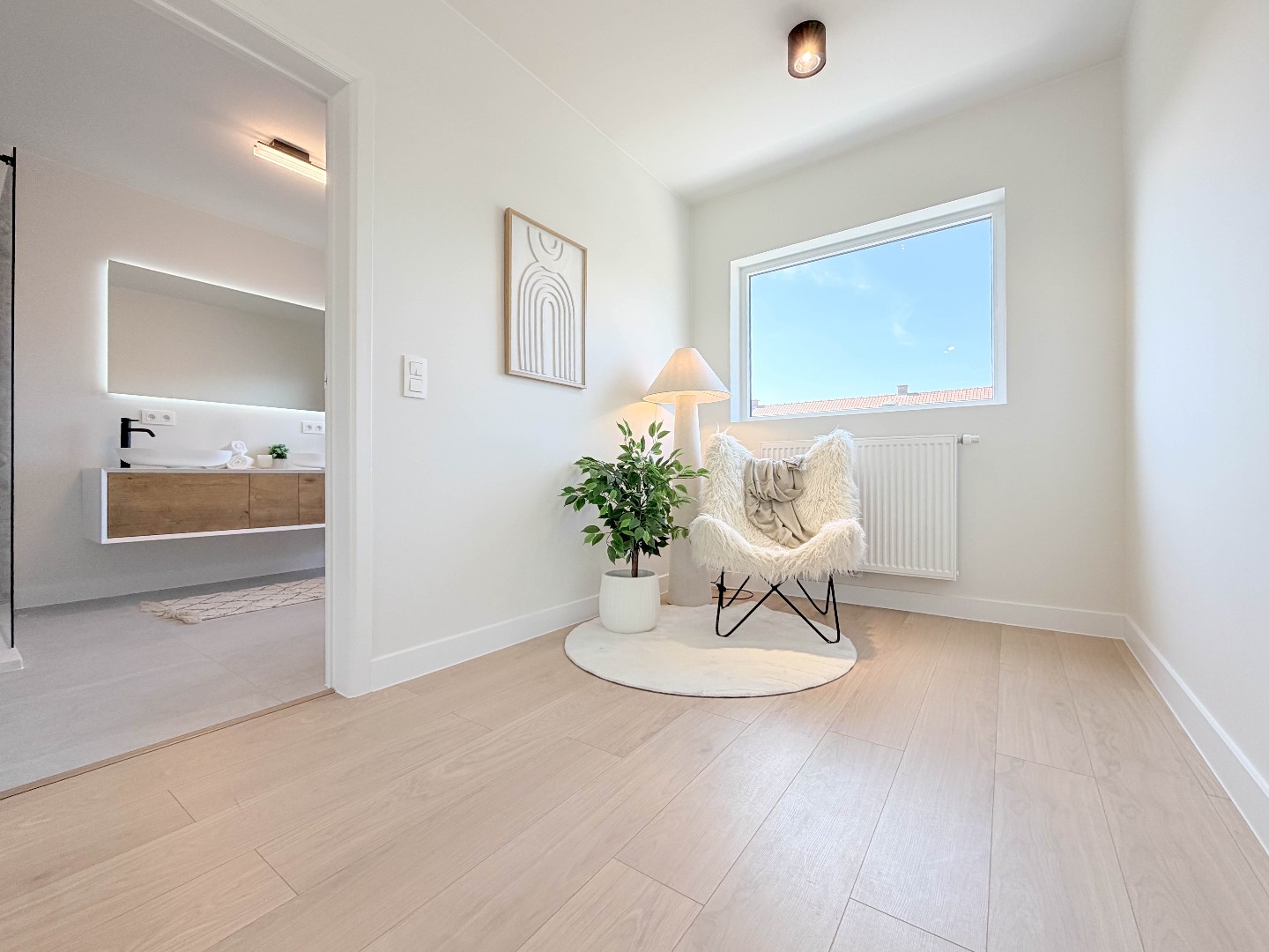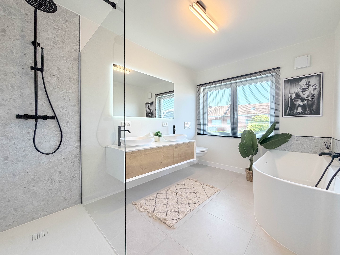 De luxueuze badkamer is uitgerust met een inloopdouche, ruim ligbad, dubbele lavabo met verlichte spiegel en een toilet, waardoor u elke dag in alle comfort kan starten of afsluiten.