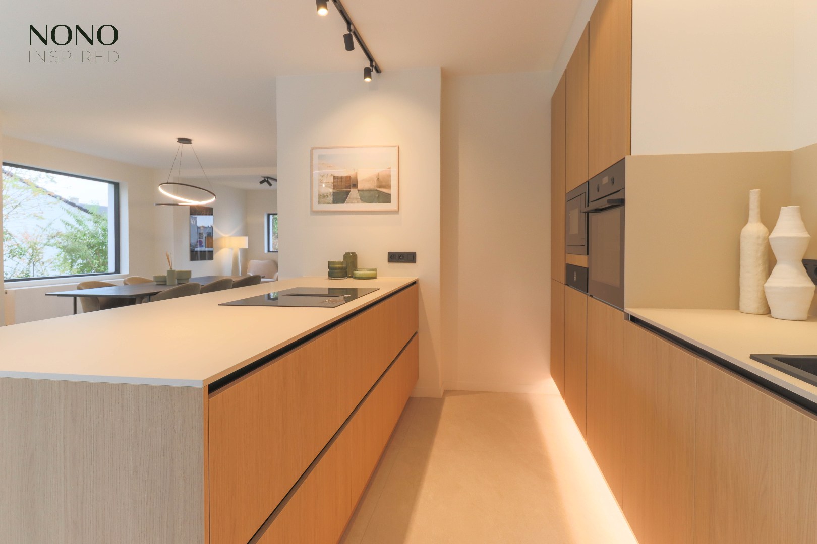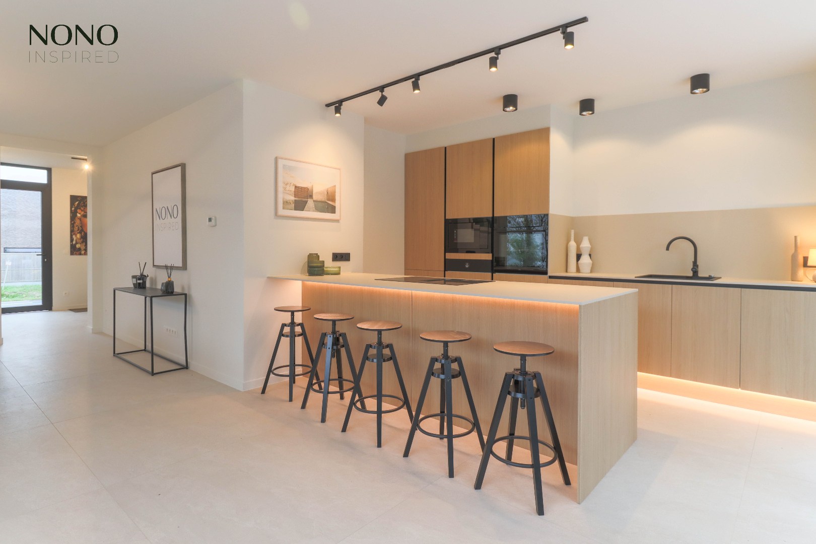 Binnen vloeien de ruimtes naadloos in elkaar over. De open, ingerichte keuken vormt het hart van de woning en biedt een prachtig zicht op de tuin met hoge bomen die rust en geborgenheid uitstralen. De leefruimte baadt in het natuurlijke licht en ademt een gezellige, aangename sfeer – een plek waar je meteen thuiskomt.