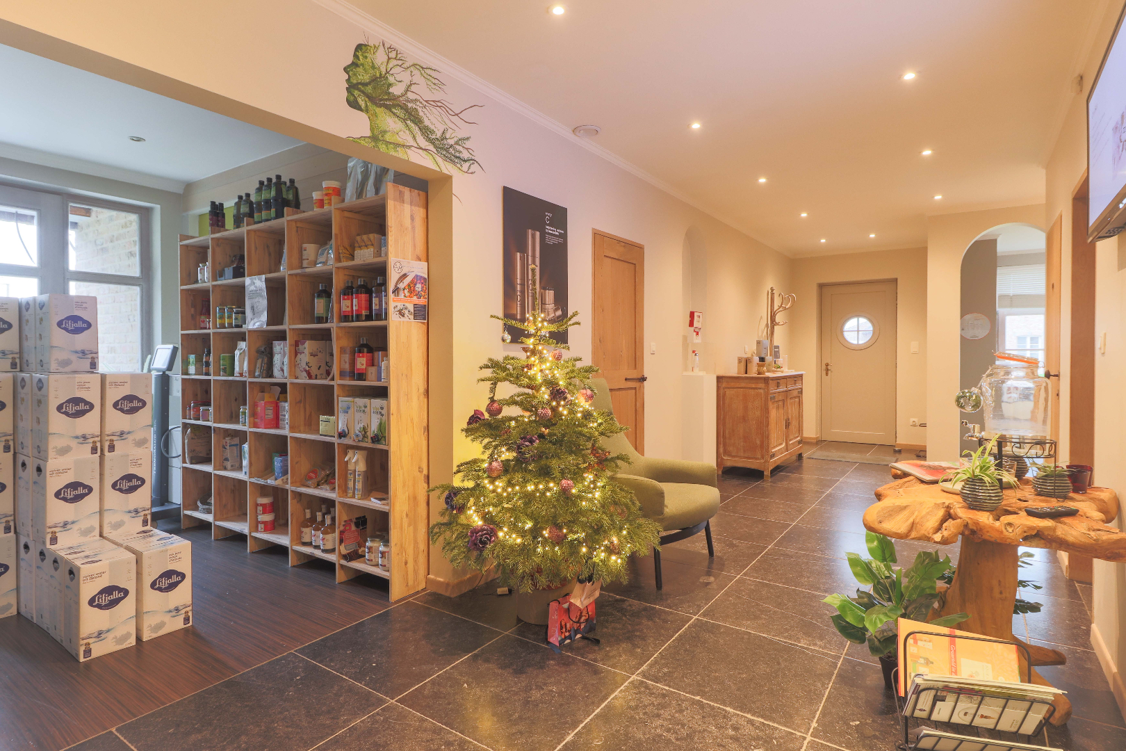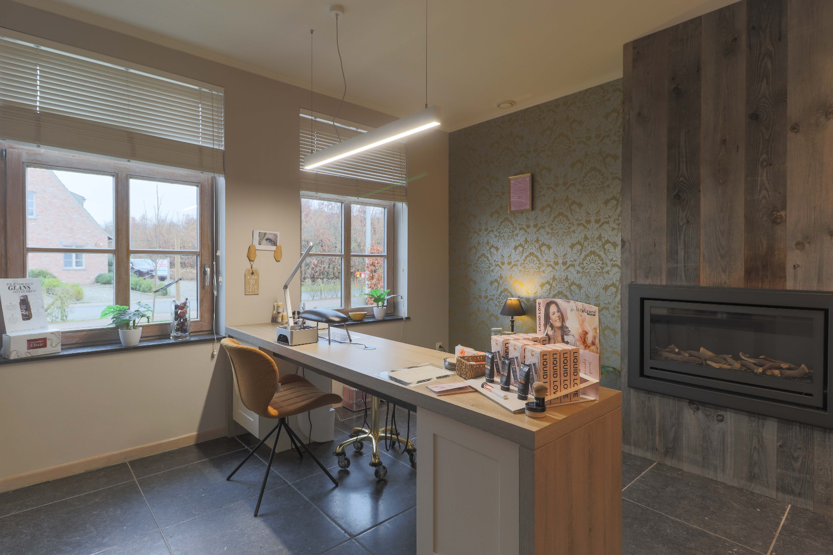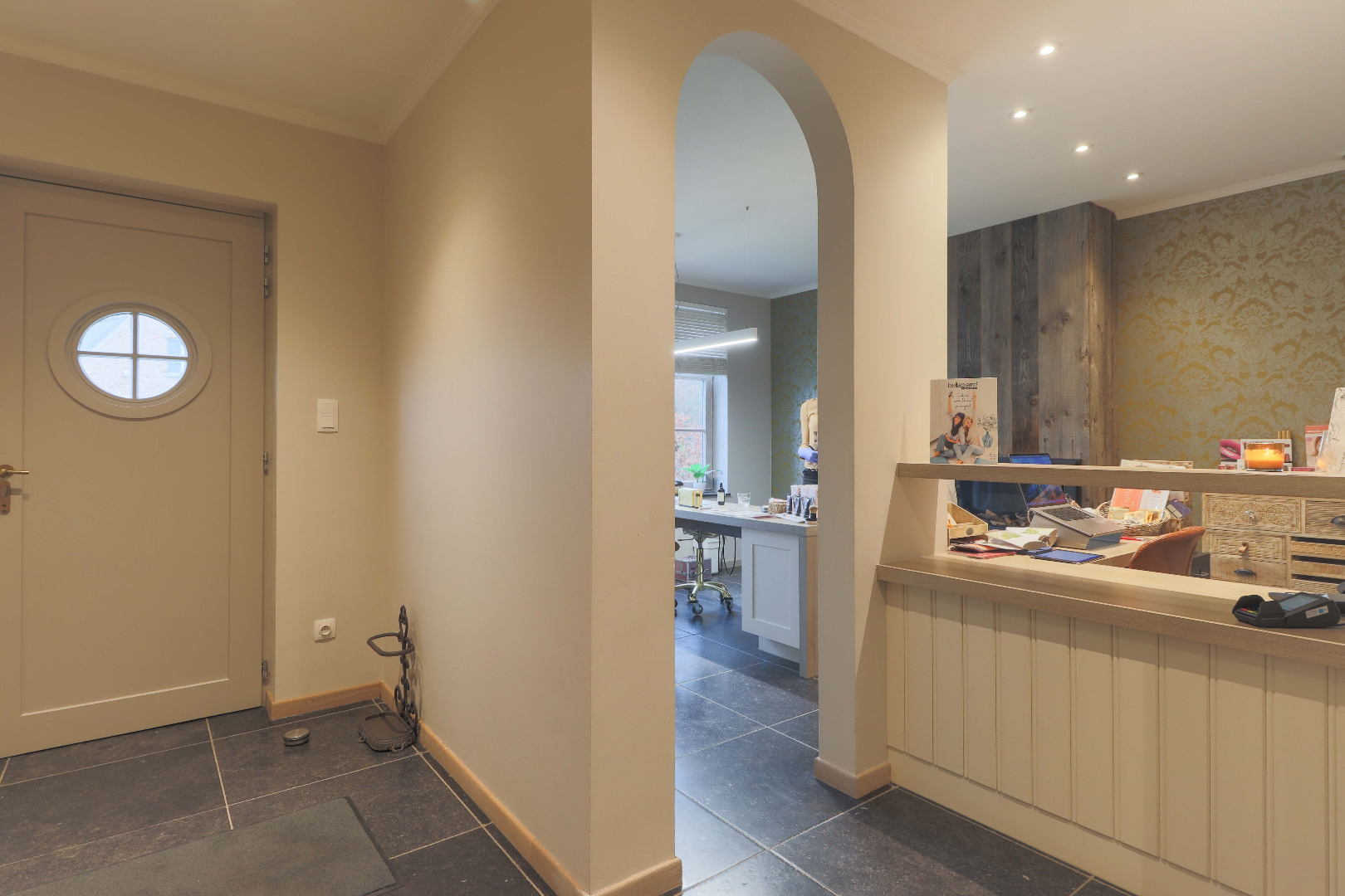 Het beneden verdiep is momenteel ingericht als schoonheidssalon, maar kan evengoed dienst doen voor ander praktijken of kantoren. Hier zijn er vier aparte kamers met nog een volledig ingerichte keuken, een verder af te werken luxe-douche.