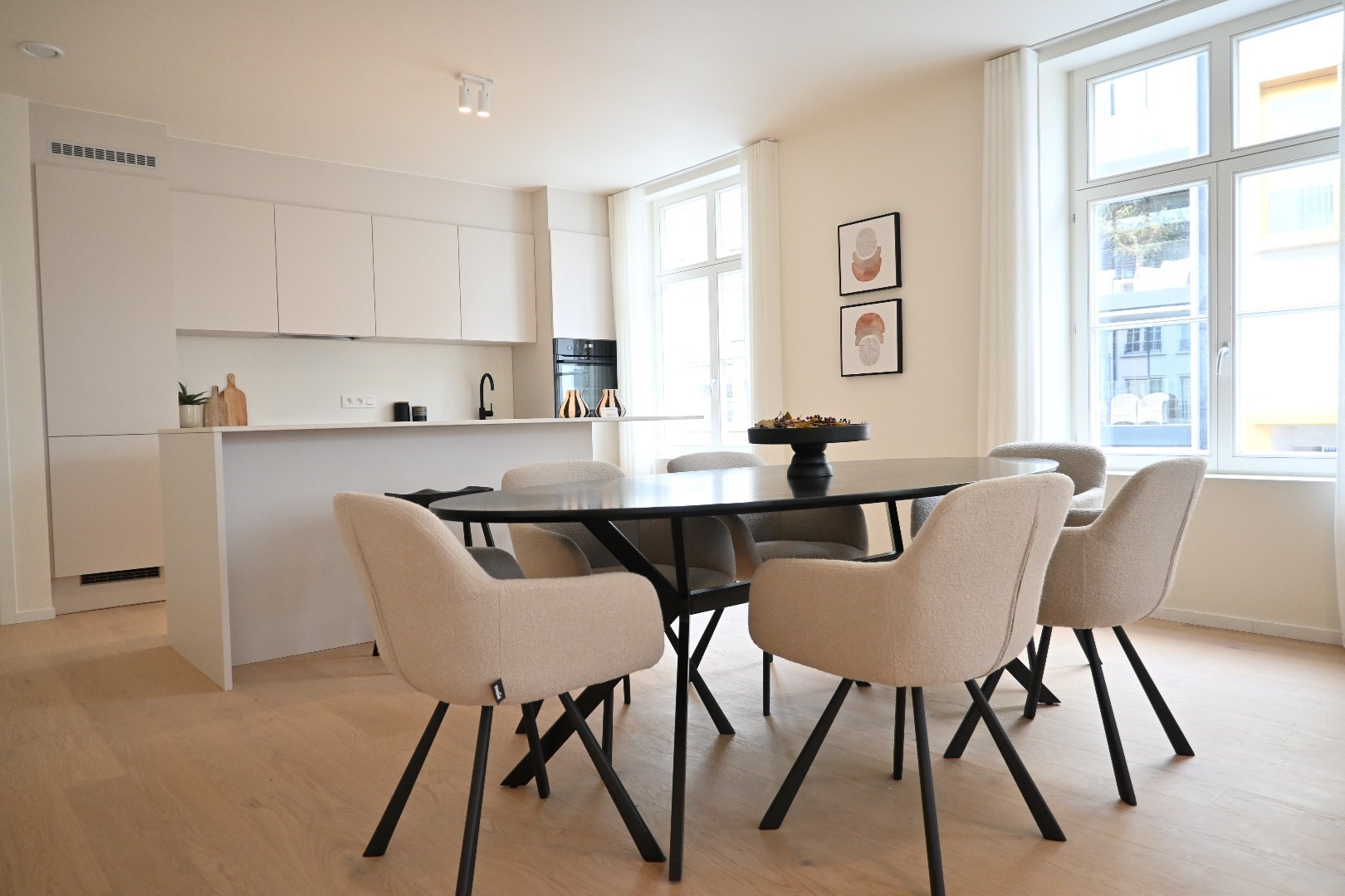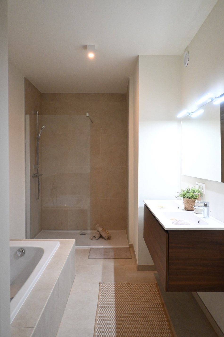 Binnen aldus mega grote leefruimte met veel lichtinval en open ingerichte moderne keuken met prachtig werkblad voorzien van alle comfort alsook ruime badkamer met inloopdouche, groot ligbad en dubbele lavabo.