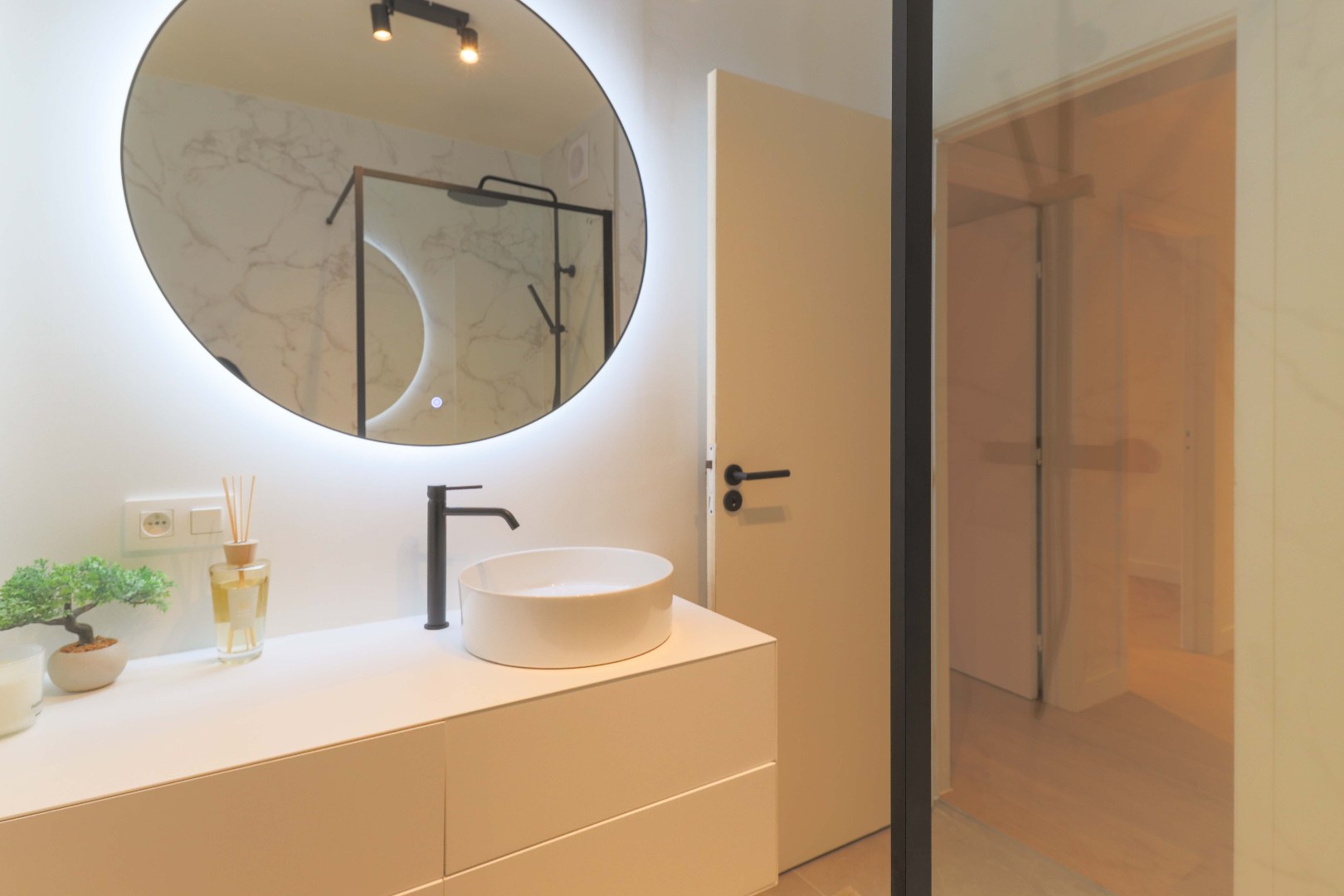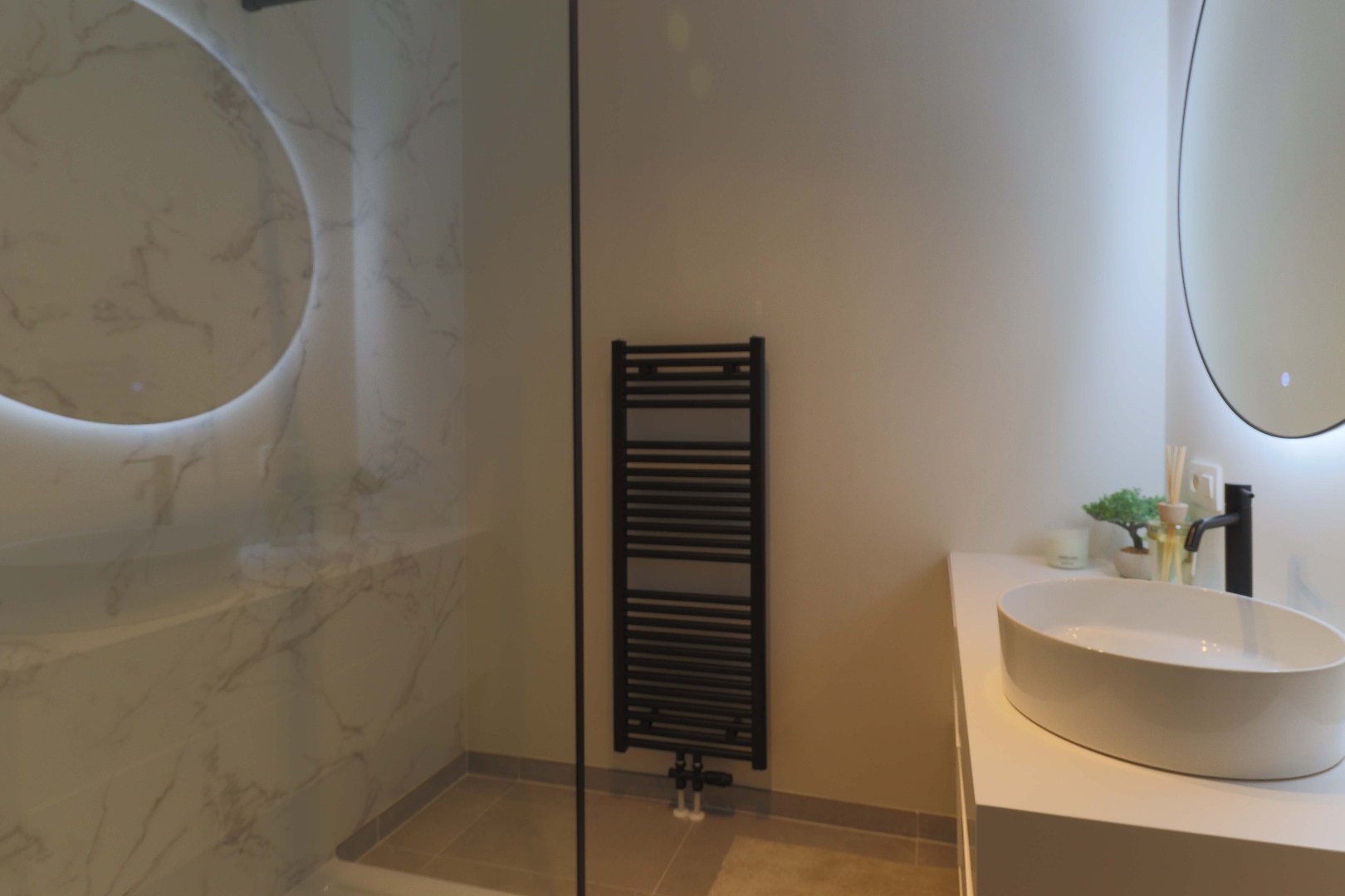 Verder hebben we een mooie badkamer met inloopdouche, en lavabo. Er is een apart toilet voorzien met daarboven een aparte bergruimte voor wasmachine en droogkast.
