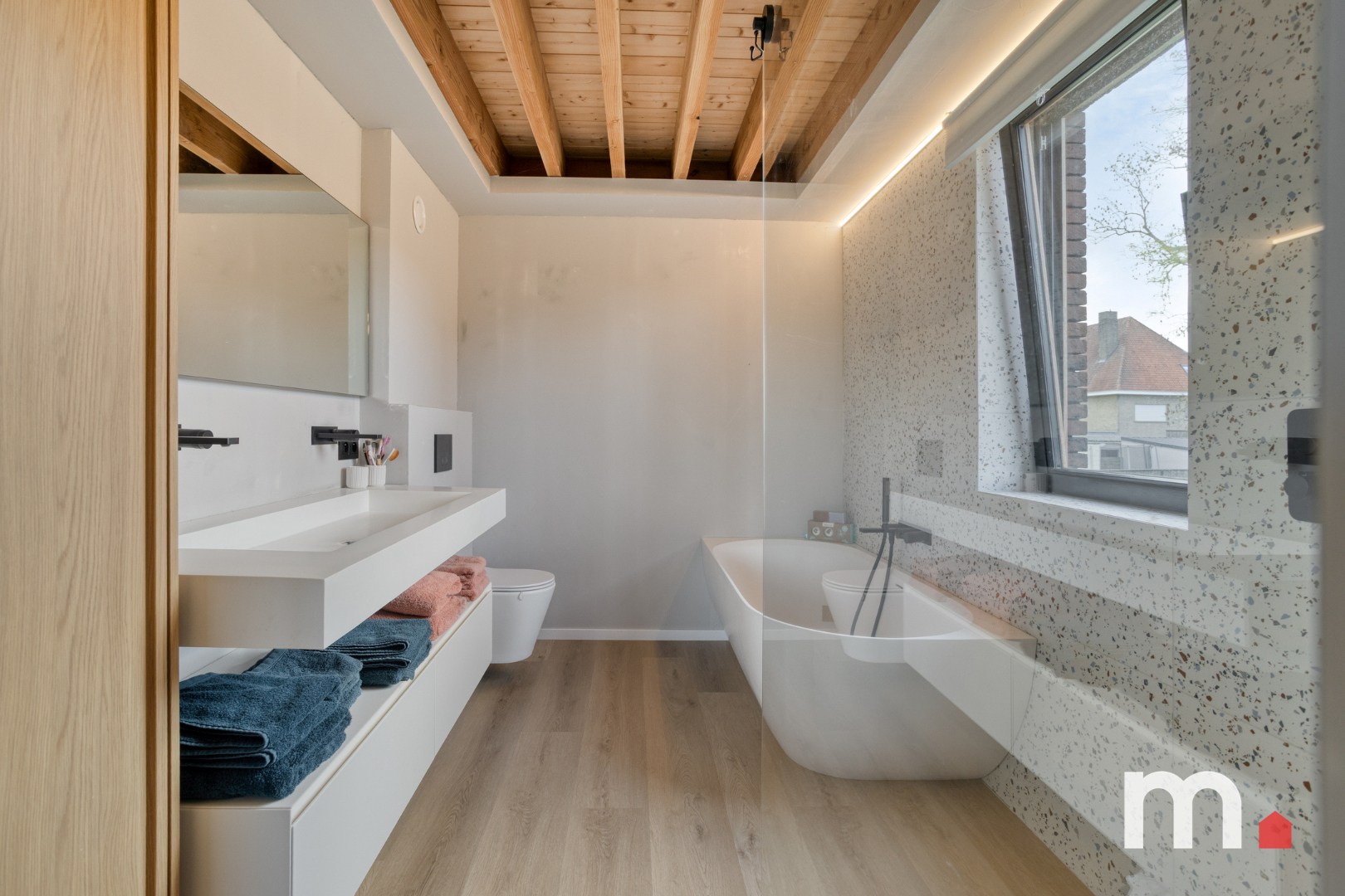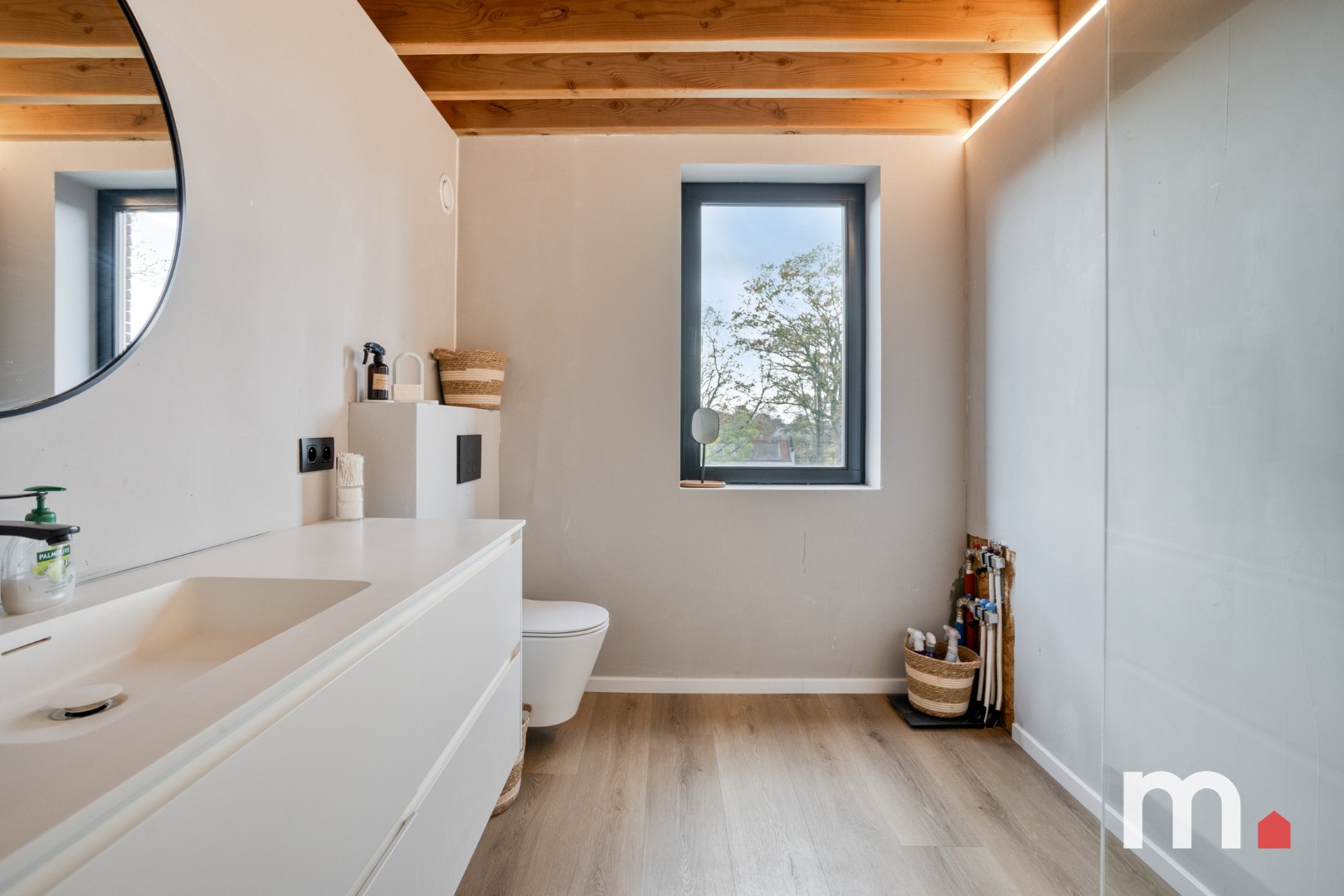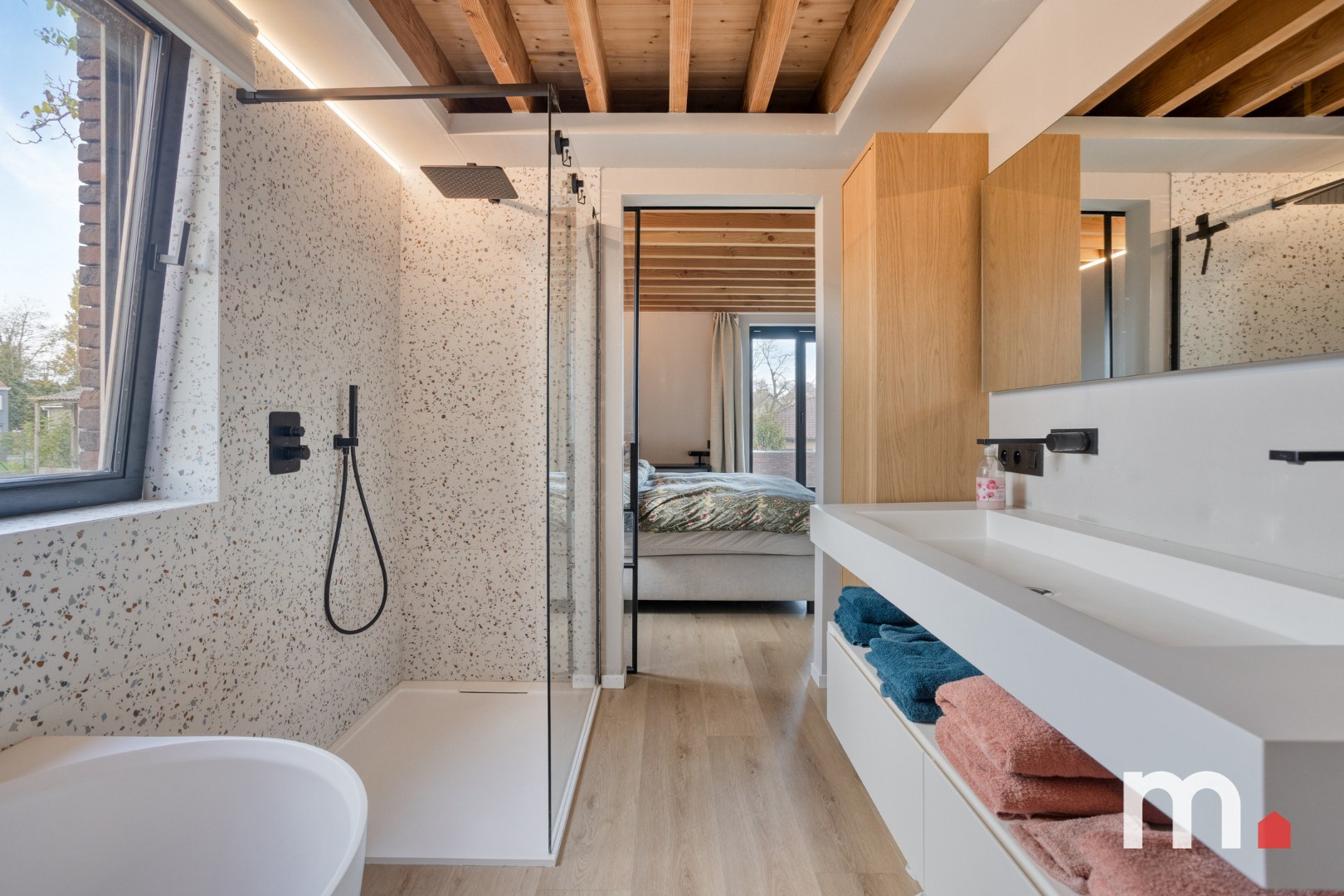 ✅ Master bedroom met aansluitend een lichtrijke badkamer voorzien van Lavabo, meubel, spiegel, ligbad, inloopdouche, ventilatie, antidamp spiegel en 2de toilet