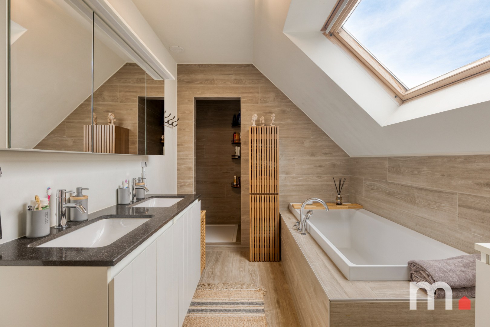 ✅ Luxe badkamer met ligbad, inloopdouche, dubbele wastafel met meubel en spiegel en handdoekdroger