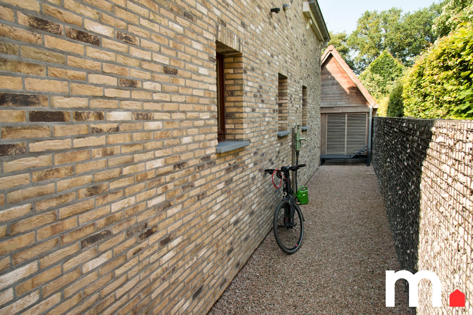 Een ruim bijgebouw of garage biedt diverse mogelijkheden: van atelier tot opslag of hobbyruimte. De oprit voorziet voldoende plaats voor de wagen.