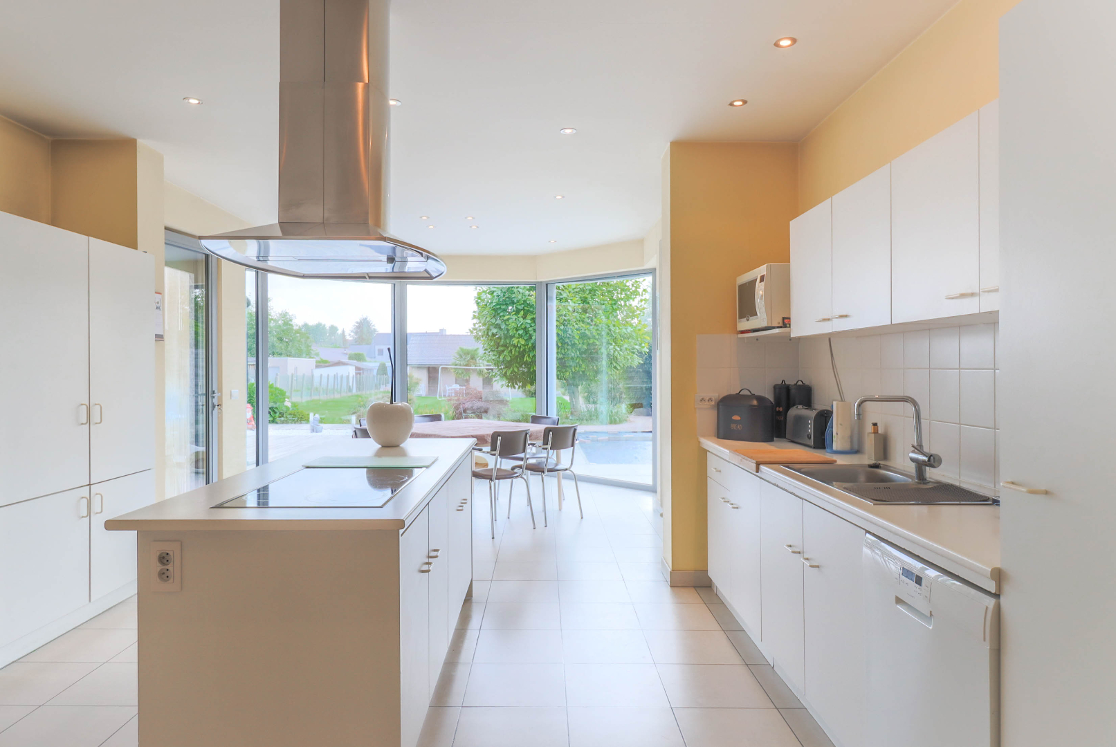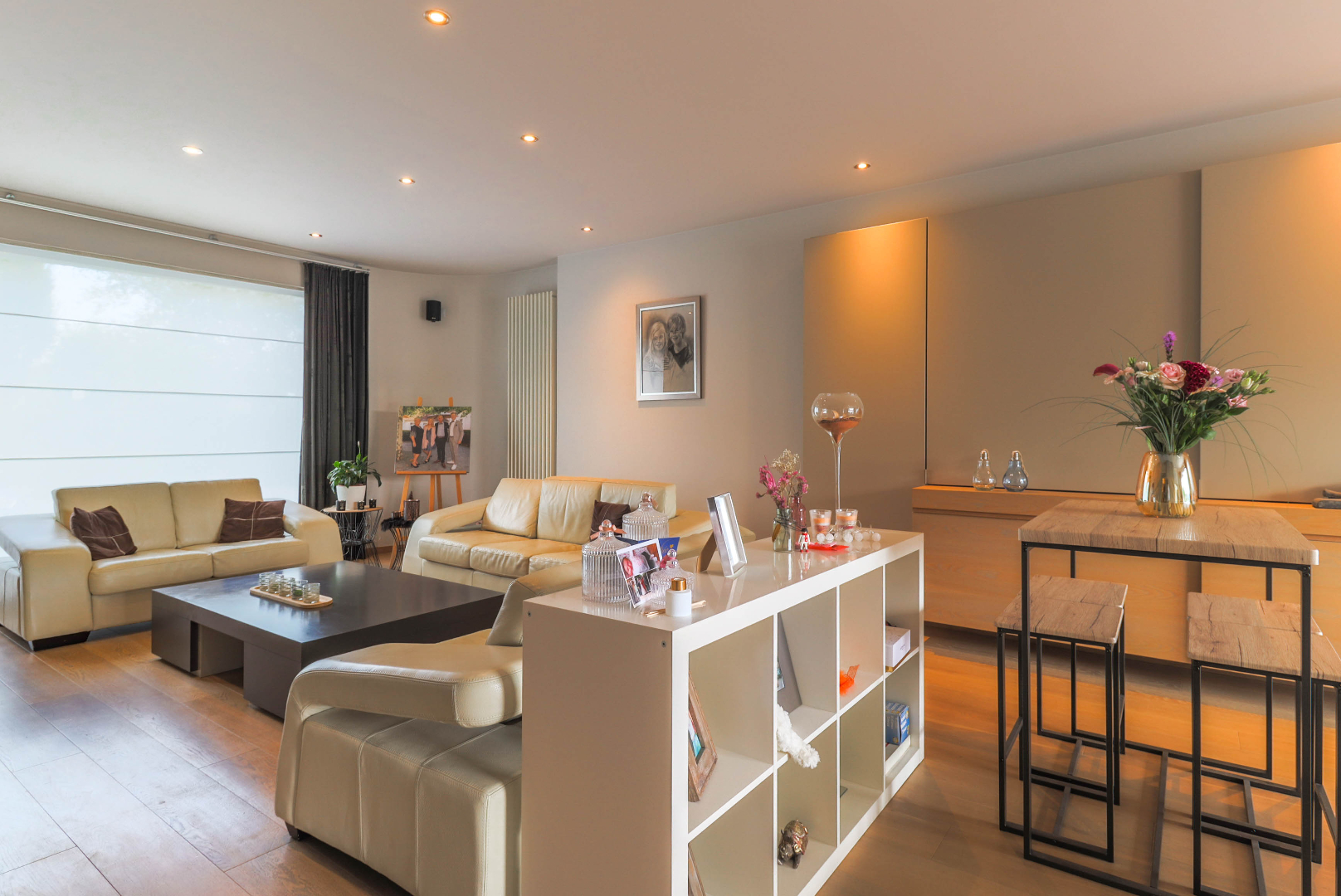 Bij het binnentreden merk je een ruime inkomhalle, aansluitend de lichtrijke leefruimtes met living en keuken uitgevend op de