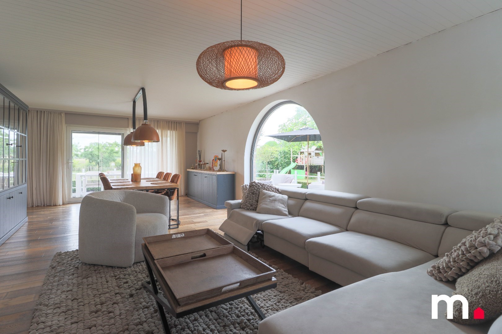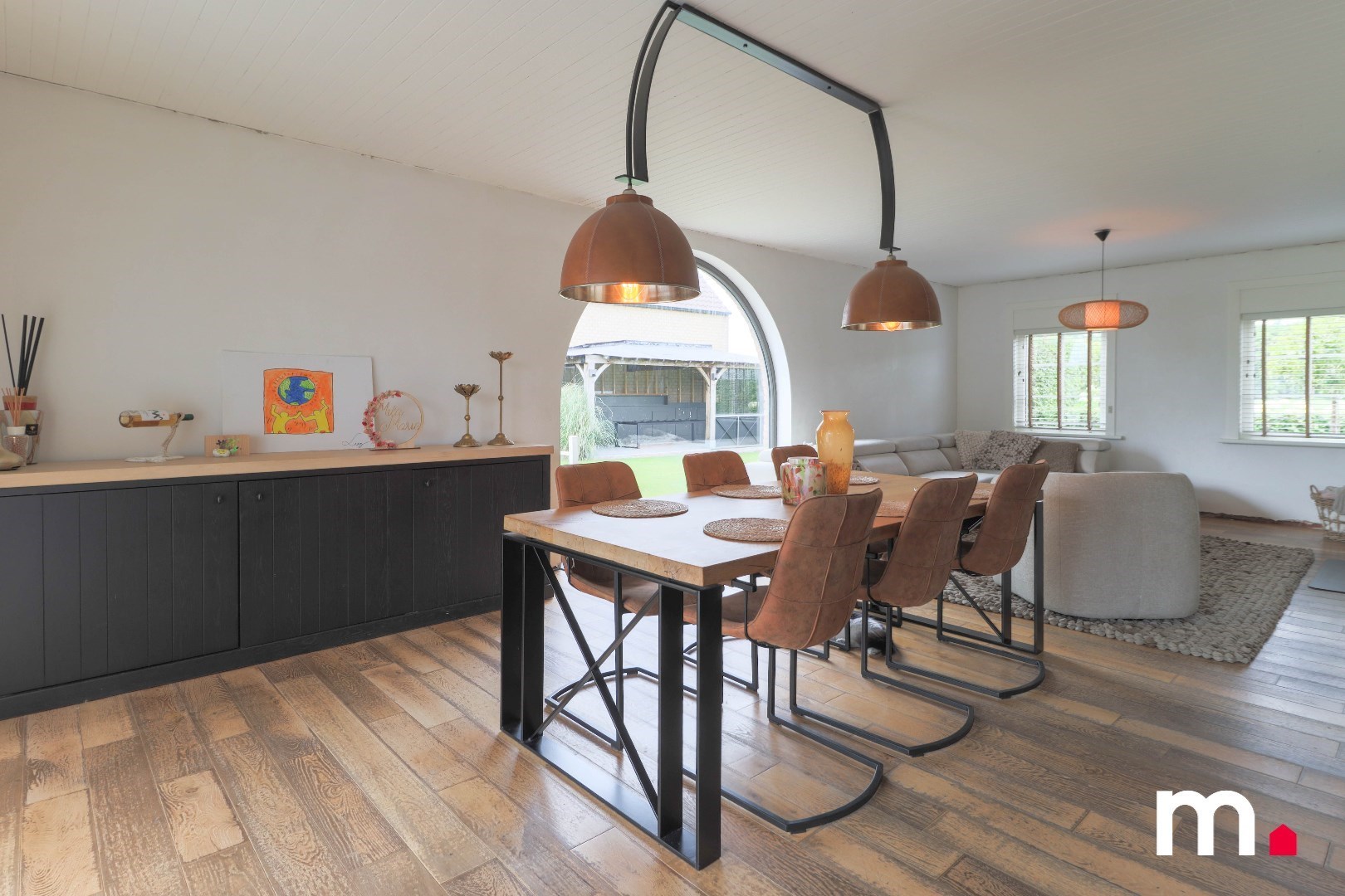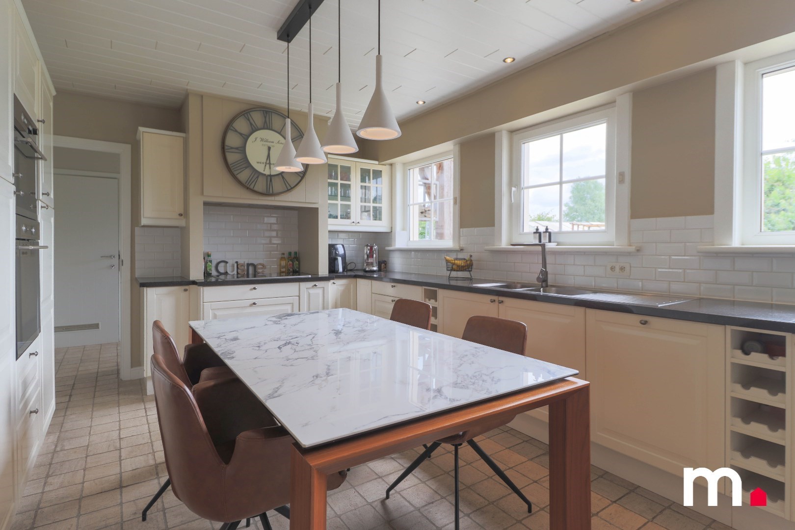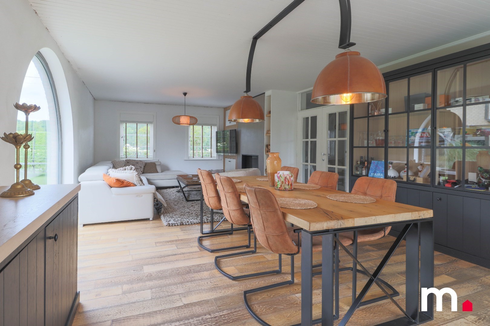 Binnenin de woning vind je een ruime en lichtrijke landelijk geïnspireerde leefruimte, waar je kunt ontspannen en tot rust kunt komen. De grote ramen zorgen voor veel natuurlijk licht en bieden een prachtig uitzicht op de groene omgeving. De keuken is volledig uitgerust en biedt voldoende ruimte om heerlijke maaltijden te bereiden.