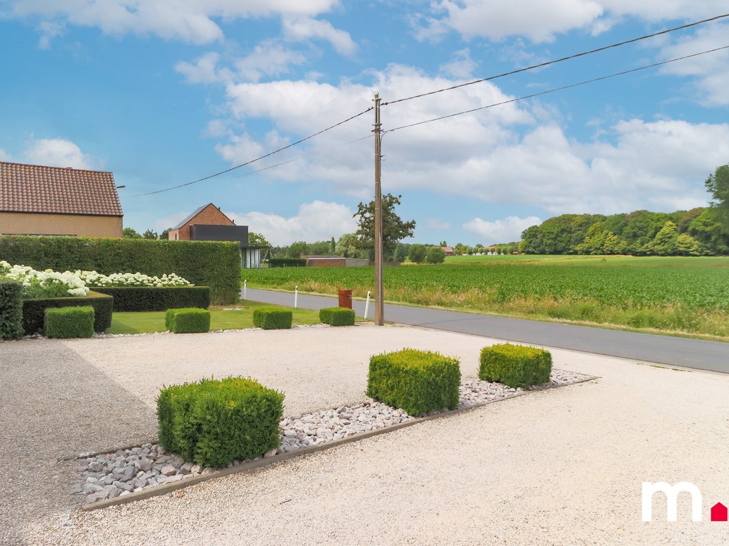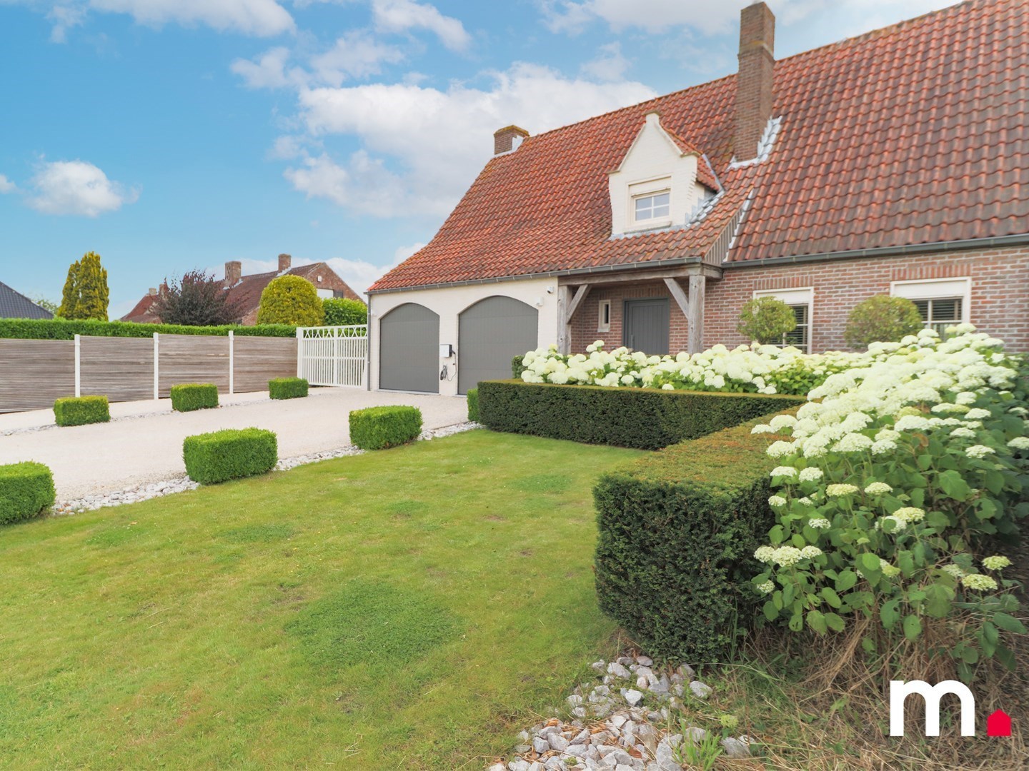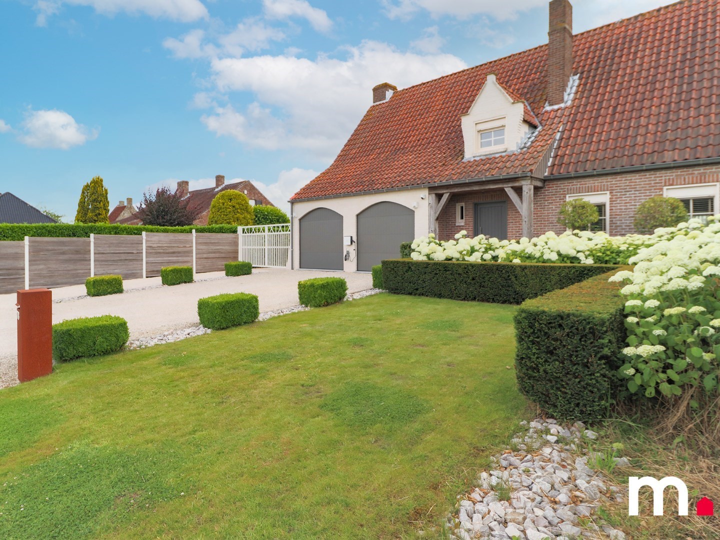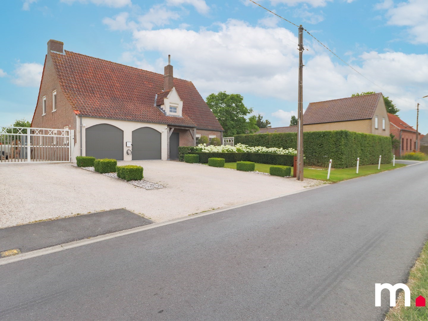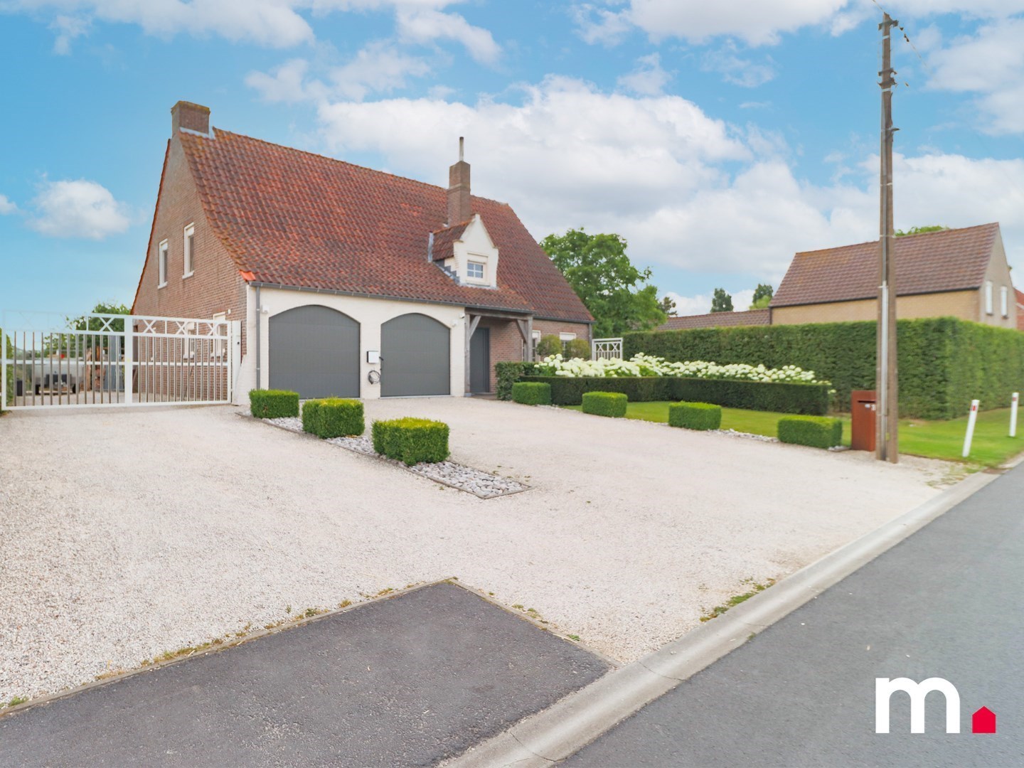 Er is tevens een ruime oprit voor de twee garage's alsook een inrijstrook met elektrische poort waar terug ruimte is voor een auto of extra bergplaats.